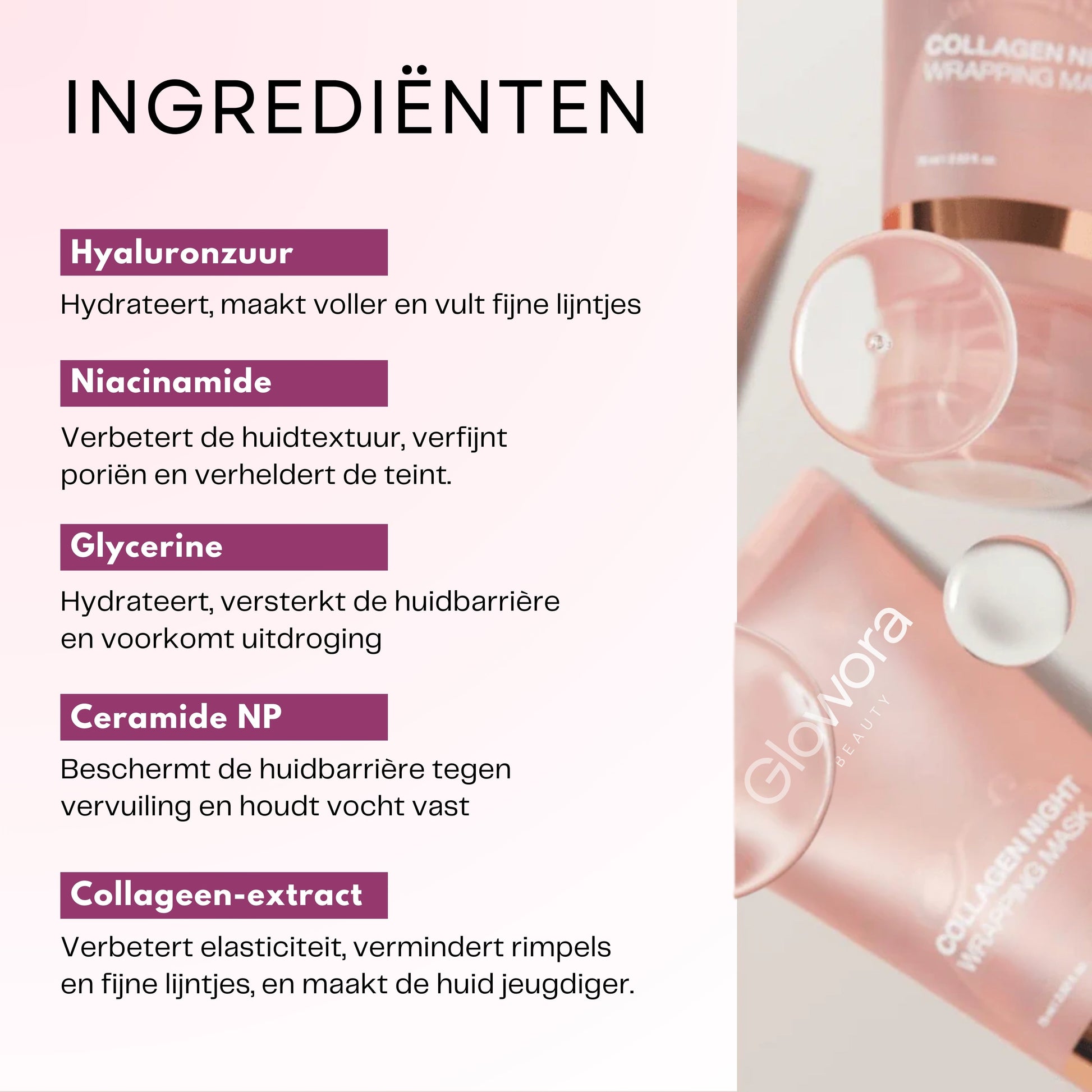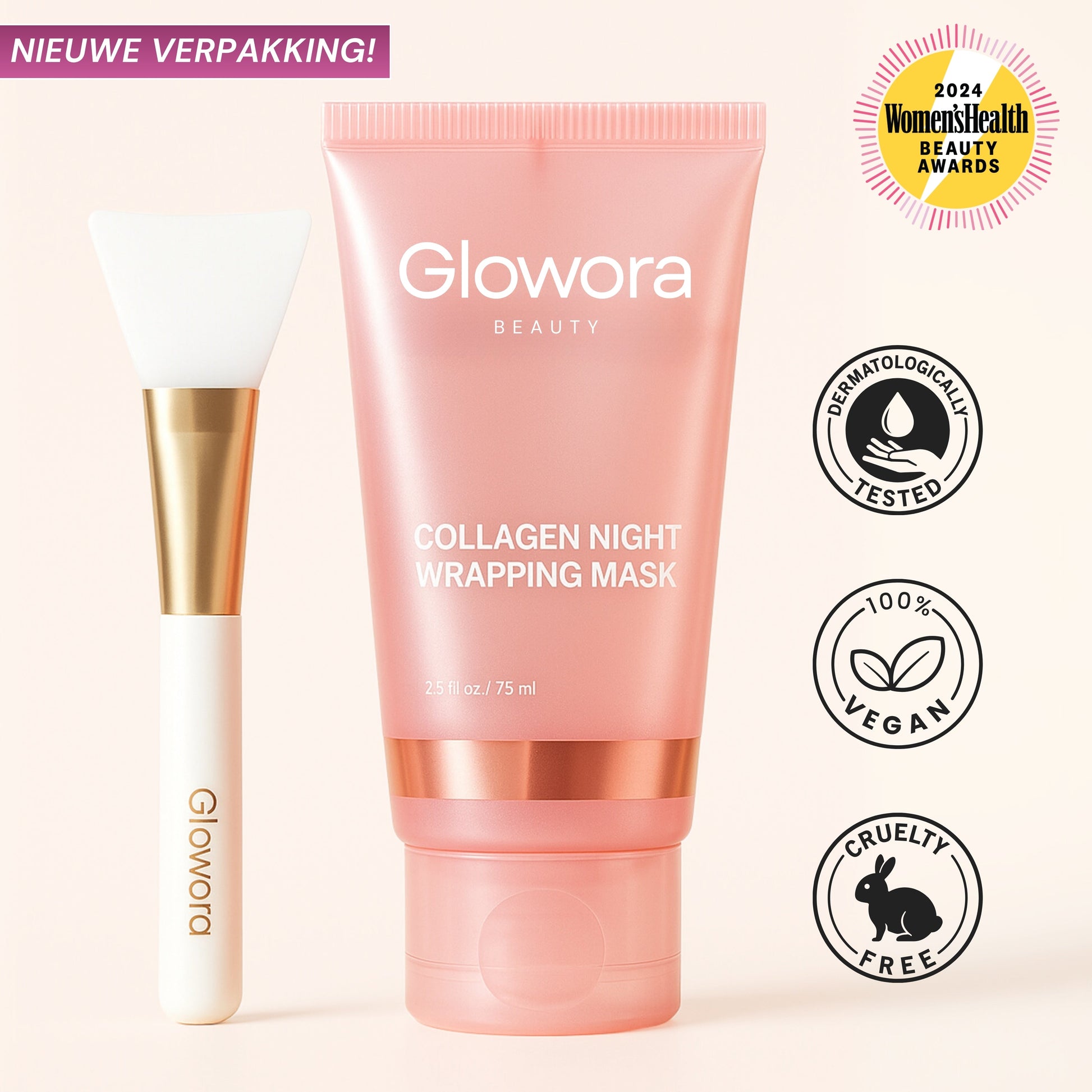 Het Koreaanse Collageen Nachtmasker met geavanceerde biotechnologie en bijpassende gezichtskwast werkt 's nachts intensief aan een gehydrateerde, stevige en egale huid. Het vermindert fijne lijntjes, vlekjes en onzuiverheden, terwijl het je teint zichtbaar egaliseert. Dankzij de unieke peel-off formule versterkt het de werking van serums en crèmes. Bij het verwijderen onthult het een perfect gladde, stralende huid met een natuurlijk glass skin-effect.